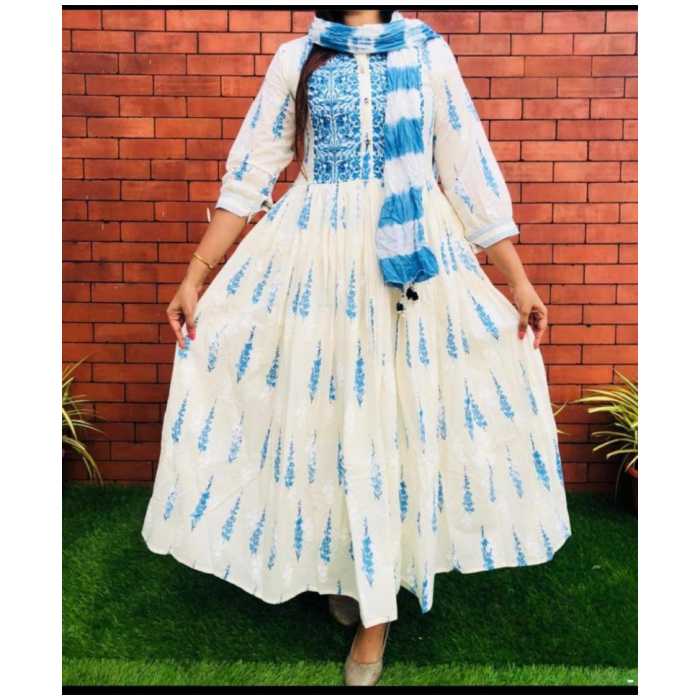 Print With Embroidery Anarkali Style Kurta With Dupatta